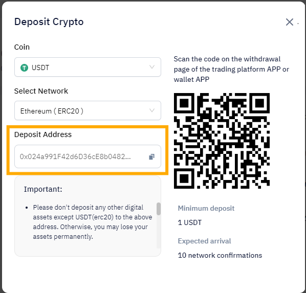 A unique deposit address for USDT will be generated.